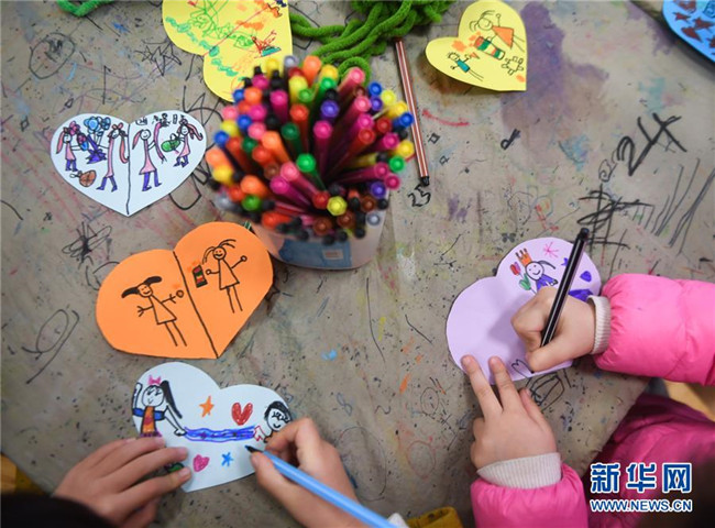 12月11日,小朋友們?cè)诶L制愛心卡片,準(zhǔn)備跟愛心圍巾一起寄給西藏的小朋友們。 新華社記者 徐昱 攝