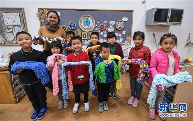 12月11日,小朋友們和老師一起展示編織好的愛心圍巾。 新華社記者 徐昱 攝