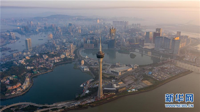11月18日無(wú)人機(jī)拍攝的澳門旅游塔、西灣湖、南灣湖景色。新華社記者 張金加 攝