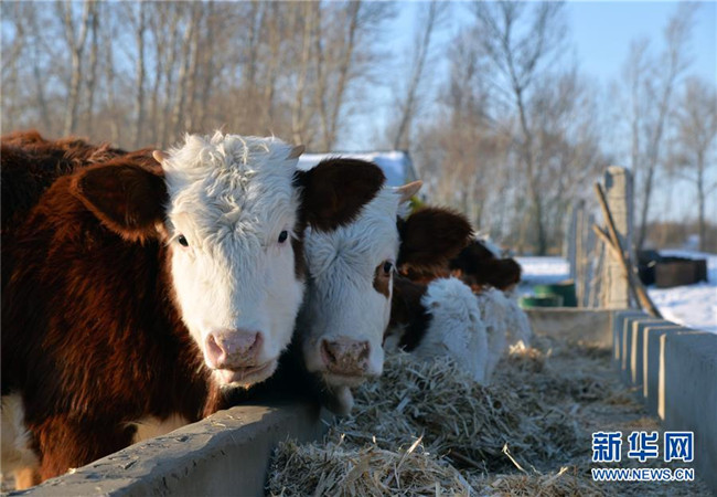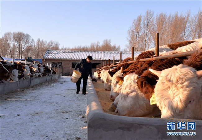 12月19日,科左后旗巴嘎塔拉蘇木劉金山養(yǎng)牛合作社的管理員劉德全在查看黃牛長勢。新華社記者徐欽攝