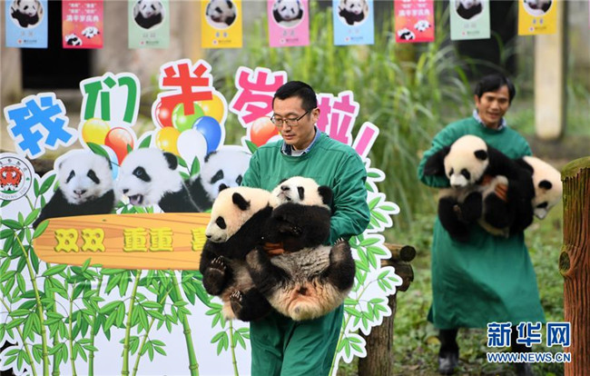 12月22日,重慶動物園4只半歲大熊貓在戶外活動。當(dāng)日,重慶動物園為4只大熊貓寶寶“雙雙”“重重”“喜喜”“慶慶”舉行半歲生日慶?;顒印?只半歲大熊貓在飼養(yǎng)員的照料下,在熊貓館運(yùn)動場內(nèi)玩耍、嬉戲,與市民游客一同過冬至。新華社記者唐奕攝