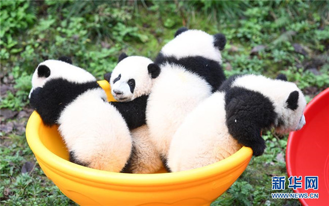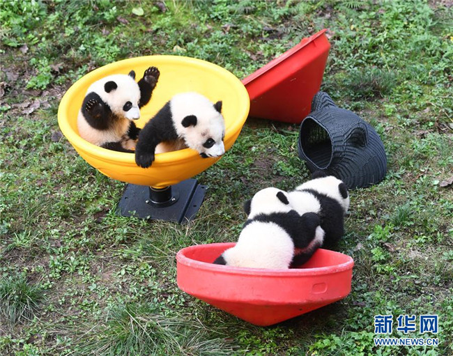 12月22日,重慶動物園4只半歲大熊貓在玩耍。當(dāng)日,重慶動物園為4只大熊貓寶寶“雙雙”“重重”“喜喜”“慶慶”舉行半歲生日慶?;顒印?只半歲大熊貓在飼養(yǎng)員的照料下,在熊貓館運(yùn)動場內(nèi)玩耍、嬉戲,與市民游客一同過冬至。新華社記者唐奕攝