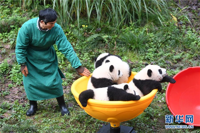 12月22日,飼養(yǎng)員引導(dǎo)大熊貓寶寶到戶外運(yùn)動。當(dāng)日,重慶動物園為4只大熊貓寶寶“雙雙”“重重”“喜喜”“慶慶”舉行半歲生日慶?;顒?。4只半歲大熊貓在飼養(yǎng)員的照料下,在熊貓館運(yùn)動場內(nèi)玩耍、嬉戲,與市民游客一同過冬至。新華社記者唐奕攝