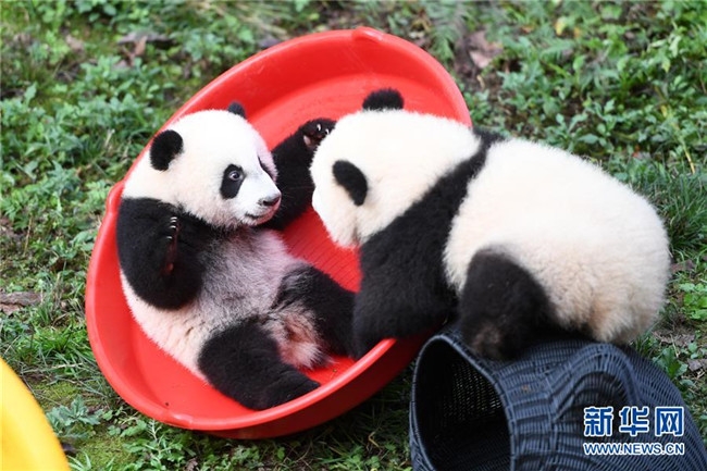 12月22日,重慶動物園兩只半歲大熊貓在玩耍。當(dāng)日,重慶動物園為4只大熊貓寶寶“雙雙”“重重”“喜喜”“慶慶”舉行半歲生日慶?;顒印?只半歲大熊貓在飼養(yǎng)員的照料下,在熊貓館運(yùn)動場內(nèi)玩耍、嬉戲,與市民游客一同過冬至。新華社記者唐奕攝