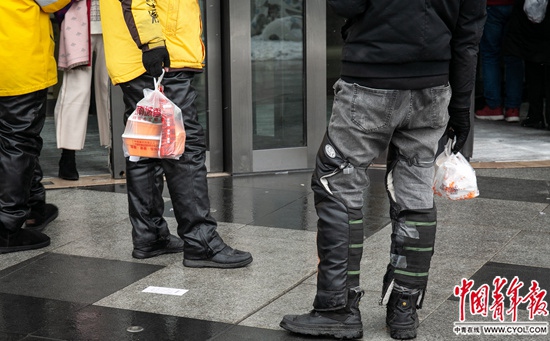 12月16日,北京通州區(qū)萬達(dá)寫字樓門口,兩位外賣員在等待顧客取餐。見習(xí)記者 張玉佳/攝