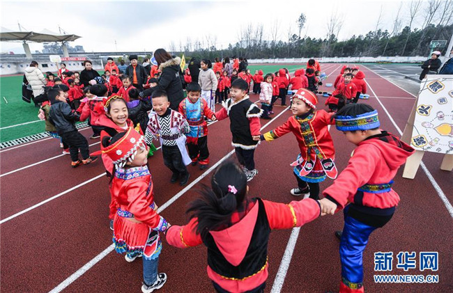 12月26日,身著少數(shù)民族服裝的孩子與同學們一起參加篝火舞活動。當日,浙江省長興縣李家巷鎮(zhèn)中心幼兒園舉辦“炫彩民族風歡樂來運動”為主題的趣味民族游戲活動。該幼兒園有一些孩子來自壯族、苗族、布依族等少數(shù)民族。幼兒園旨在通過這種活動,讓孩子們和家長共同體驗竹竿舞、篝火舞、擲糠包等少數(shù)民族特色游戲,了解少數(shù)民族特色文化。新華社記者徐昱攝