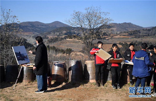一名藝術家(左一)和洛寧縣羅嶺鄉(xiāng)初級中學的學生們在洛寧縣前河村進行繪畫創(chuàng)作(12月29日攝)。新華社記者 李嘉南 攝