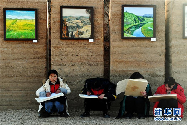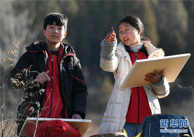 洛寧縣羅嶺鄉(xiāng)初級中學學生在洛寧縣前河村進行繪畫創(chuàng)作(12月29日攝)。新華社記者 李嘉南 攝