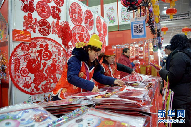1月8日,商販在內(nèi)蒙古國際會展中心售賣窗花等年貨。新華社記者 王靖 攝
