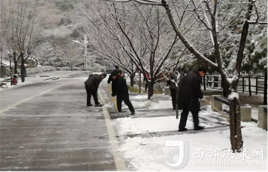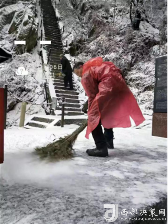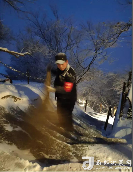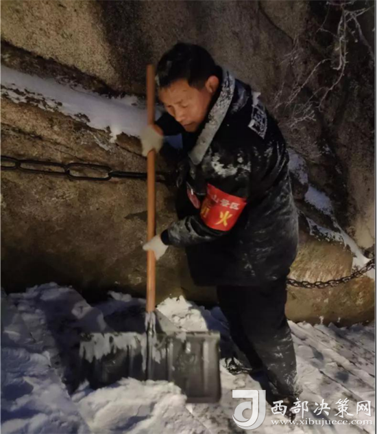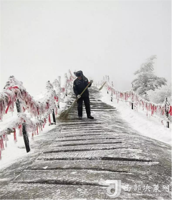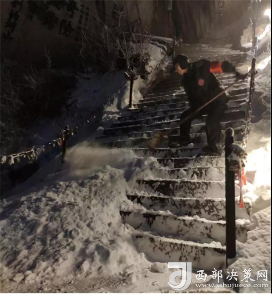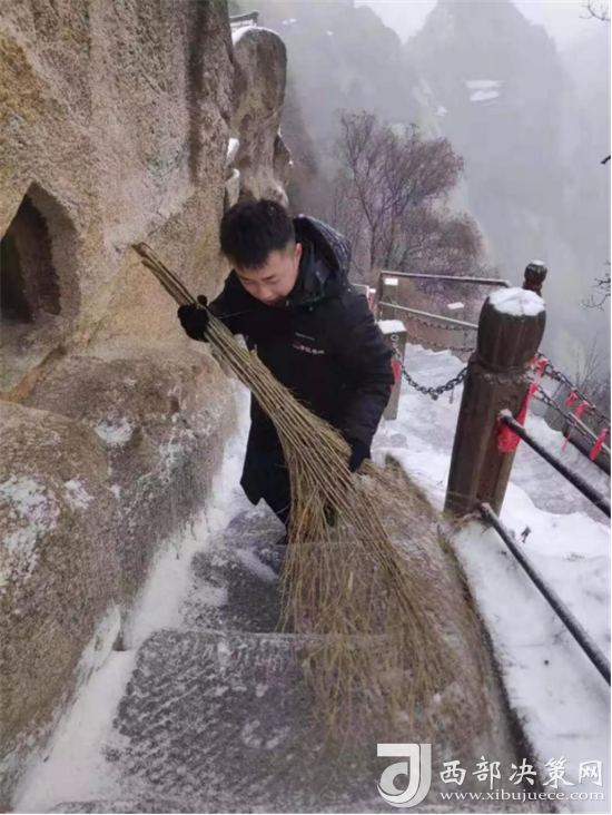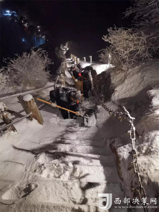 清晨天亮后,工作人員以常態(tài)化的工作要求持續(xù)對道路積雪進行細化清掃,防止路面結(jié)冰,發(fā)生安全事故。(供稿:華山景區(qū)管理公司)
