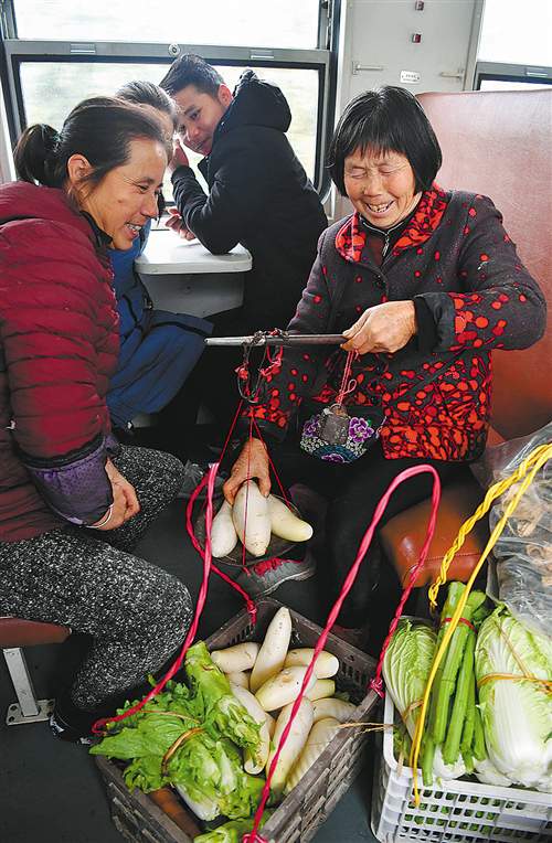 扶貧列車上的列車員常年與沿線各族群眾打交道,與他們建立了深厚的感情。針對沿線老百姓實際需求,在保證列車安全的情況下,列車適度開放交易“微市場”,允許在公平原則下進行農(nóng)副產(chǎn)品市場化交易,車班自購電子彈簧秤、一次性塑料袋等,必要時幫助旅客解決買賣雙方的不時之需,為列車商品交易提供便利。針對沿線百姓挑擔(dān)、背筐乘車等情況,列車加強與車站聯(lián)系,對一些客流量較大、貨物集中的車站,由列車長提前與車站進行聯(lián)系,車班乘務(wù)組提前做好準備,開雙邊門,加強列車疏通,協(xié)助旅客安全乘降,確保安全正點。