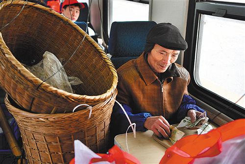 ▲??吭诤鲜÷殛柟赫镜?272次列車,當(dāng)?shù)毓r(nóng)菜農(nóng)挑著擔(dān)子準備上車。這趟“慢火車”所經(jīng)過的地區(qū)多為“老少邊窮”,經(jīng)濟欠發(fā)達。為盤活沿途百姓致富渠道,鐵路部門開“綠燈”允許乘客攜帶大量鮮活貨物乘車。