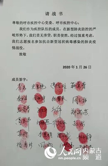 1月26日,1000封按滿紅手印的請(qǐng)戰(zhàn)書“刷屏”了。“在全國(guó)上下齊心協(xié)力共同抗擊新型冠狀病毒感染的肺炎疫情之際,請(qǐng)各位主任統(tǒng)計(jì)匯總本科室主動(dòng)申請(qǐng)隨時(shí)去抗疫前線的醫(yī)師,并將自愿報(bào)名的名單發(fā)至本群。”呼和浩特市第一醫(yī)院普外科主任醫(yī)師烏云塔娜把“請(qǐng)戰(zhàn)”信息發(fā)到微信群后,手機(jī)就一直響個(gè)不停。不到一天,呼和浩特市第一醫(yī)院主動(dòng)“請(qǐng)戰(zhàn)”的醫(yī)護(hù)人員就達(dá)到200多人。