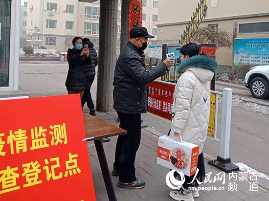 社區(qū)工作人員對(duì)出入小區(qū)的居民進(jìn)行登記并測(cè)量體溫。呼和浩特市富麗社區(qū)供圖