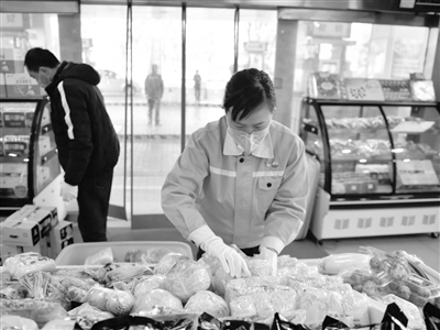 2月3日,中國石油天然氣股份有限公司青海西寧銷售分公司市區(qū)五四網(wǎng)點工作人員在貨架上整理蔬菜。