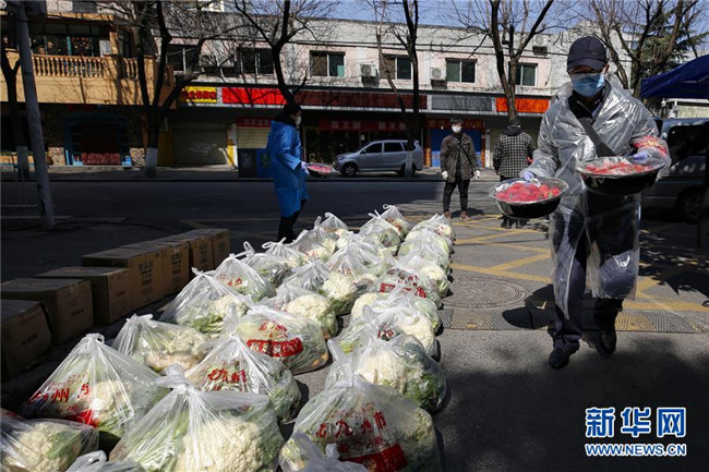 在武漢,下沉花橋社區(qū)的干部在搬運居民訂購的草莓(2月20日攝)。 新華社記者 沈伯韓 攝