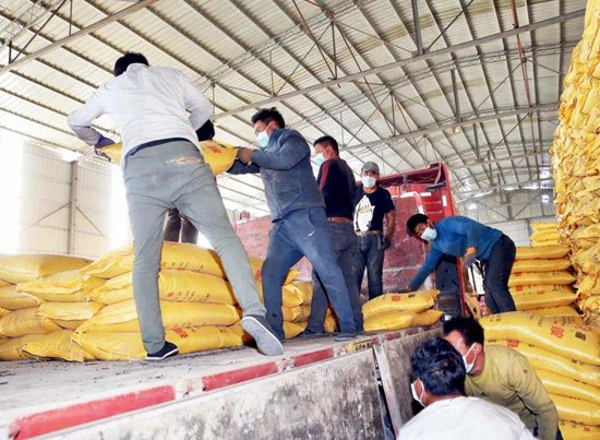 西藏農(nóng)投集團化肥倉庫現(xiàn)有庫存2萬多噸化肥,工人們正在忙碌搬運。西藏日報記者 姚海全 攝