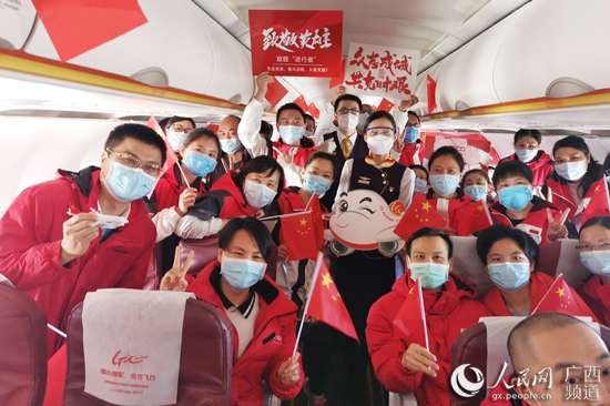 廣西援鄂醫(yī)療隊隊員在飛機(jī)上合影。韓林供圖