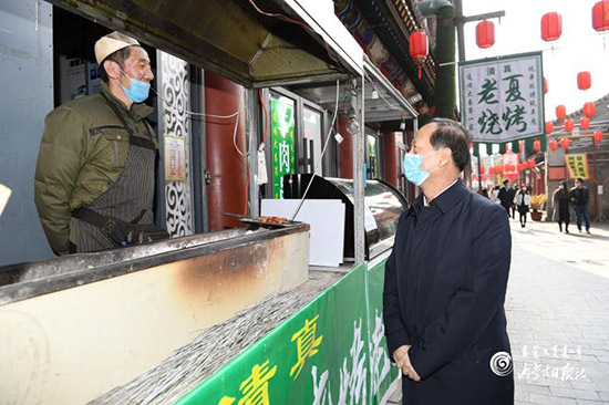 3月29日,自治區(qū)黨委書(shū)記、人大常委會(huì)主任石泰峰在呼和浩特市玉泉區(qū)塞上街了解商戶經(jīng)營(yíng)情況。內(nèi)蒙古日?qǐng)?bào)社融媒體記者 袁永紅 攝
