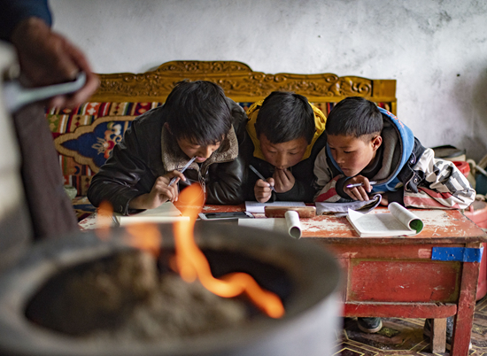 扎西卓瑪在寄宿制學(xué)校上學(xué),在校時(shí)總是很早就起床背誦課文,可在家就需要靠自覺了。
