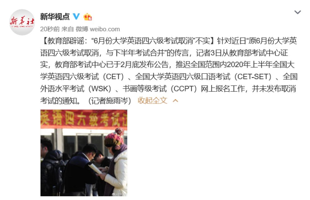 針對(duì)近日“原6月份大學(xué)英語(yǔ)四六級(jí)考試取消,與下半年考試合并”的傳言,記者3日從教育部考試中心證實(shí),教育部考試中心已于2月底發(fā)布公告,推遲全國(guó)范圍內(nèi)2020年上半年全國(guó)大學(xué)英語(yǔ)四六級(jí)考試(CET)、全國(guó)大學(xué)英語(yǔ)四六級(jí)口語(yǔ)考試(CET-SET)、全國(guó)外語(yǔ)水平考試(WSK)、書畫等級(jí)考試(CCPT)網(wǎng)上報(bào)名工作,并未發(fā)布取消考試的通知。