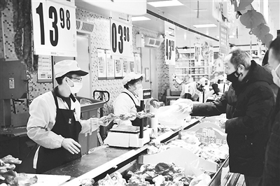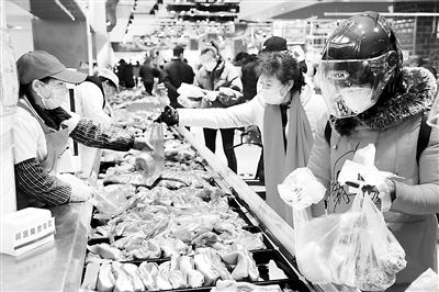 近來(lái),各地采取多種措施,在疫情防控期間保障豬肉市場(chǎng)供應(yīng),滿足居民消費(fèi)需求。圖為市民在河南省鄭州市一家大型超市內(nèi)采購(gòu)豬肉。新華社記者 馮大鵬攝