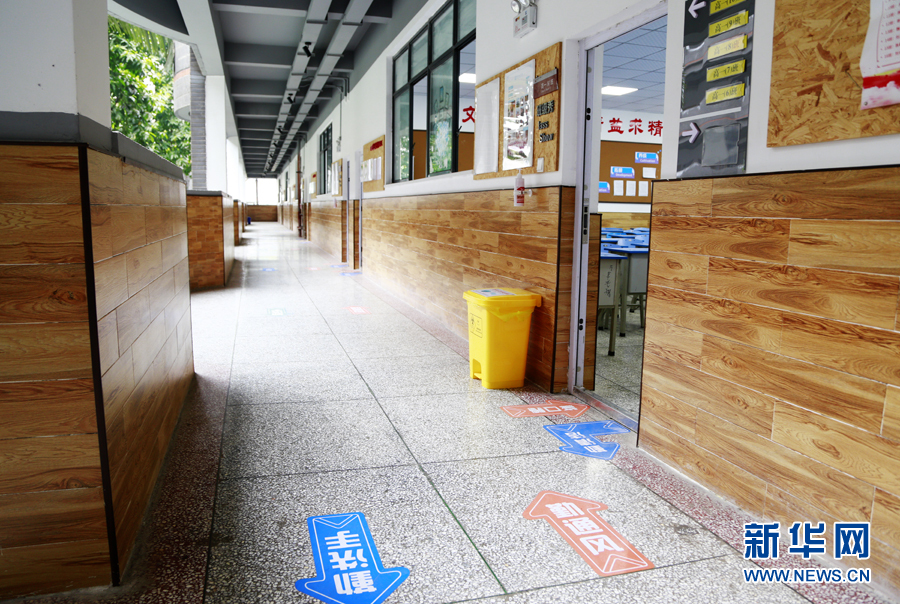 在重慶市第十一中學(xué),為避免人流聚集,在公眾通道處學(xué)校設(shè)置了行進(jìn)方向指示標(biāo)識(shí)以引導(dǎo)師生。新華網(wǎng) 彭博攝