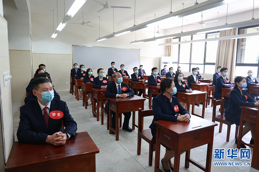 在重慶市第八中學(xué)教室內(nèi),學(xué)生座位保持了一定間距,學(xué)生單人單座,盡量避免上課期間相互接觸。圖為教師演練上課場(chǎng)景。新華網(wǎng)發(fā)