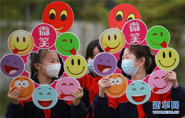 5月8日,在湖北省宜昌市秭歸縣第一中學(xué),老師在上網(wǎng)課前手拿自制的笑臉卡與學(xué)生互動。 當(dāng)日是世界微笑日。 新華社發(fā)(向紅梅 攝)