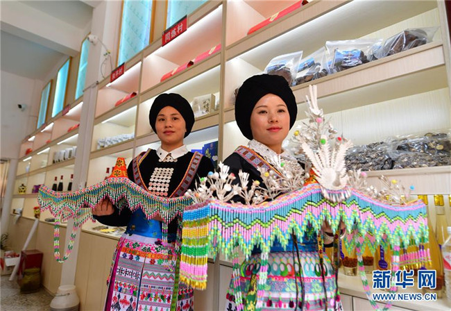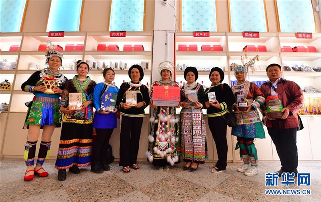 5月12日,在廣西融水苗族自治縣同練瑤族鄉(xiāng)民族廣場,少數(shù)民族群眾在展示特色產(chǎn)品。新華社記者 黃孝邦 攝