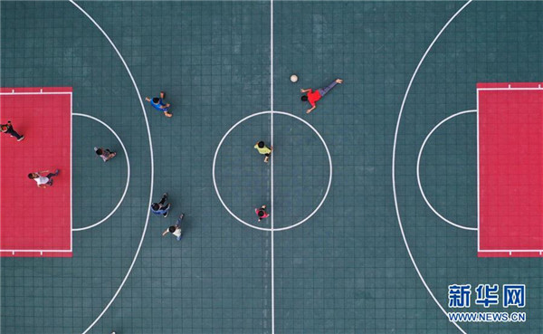 在廣西融水苗族自治縣桿洞鄉(xiāng)黨鳩小學(xué),學(xué)生們在新球場上踢球(5月13日攝,無人機(jī)照片)。新華社記者黃孝邦攝