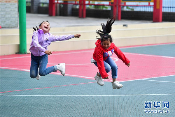 在廣西融水苗族自治縣桿洞鄉(xiāng)黨鳩小學(xué),學(xué)生在新球場上跳繩(5月13日攝)。新華社記者黃孝邦攝