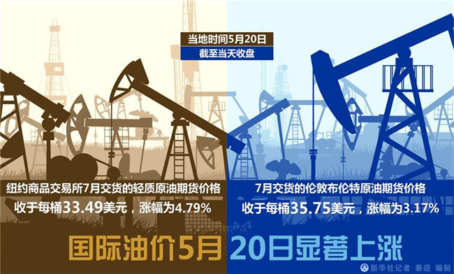 截至當(dāng)天收盤,紐約商品交易所7月交貨的輕質(zhì)原油期貨價(jià)格上漲1.53美元,收于每桶33.49美元,漲幅為4.79%。7月交貨的倫敦布倫特原油期貨價(jià)格上漲1.1美元,收于每桶35.75美元,漲幅為3.17%。