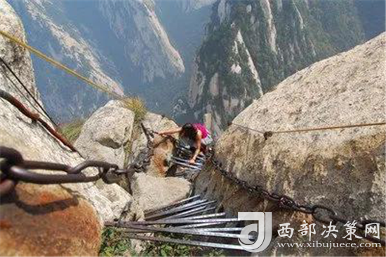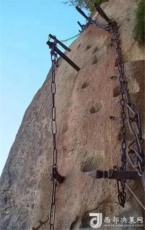 華山還有一處常人不敢涉足的險(xiǎn)境--- 鷂子翻身。鷂子翻身在華山東峰是通往下棋亭的必由之路。其路鑿于懸崖上,下視唯見(jiàn)寒索垂于凌空,不見(jiàn)路徑。游人至此,需面壁挽索,以腳尖探尋石窩,交替而下,其中幾步需如鷹鷂一般、左右翻轉(zhuǎn)身體才可通過(guò)。此景只留英雄客,婦孺難聞幾聲咳。這句話現(xiàn)在也未然,巾幗不讓須眉,以后應(yīng)是往來(lái)無(wú)懼者,皆是英雄客了。