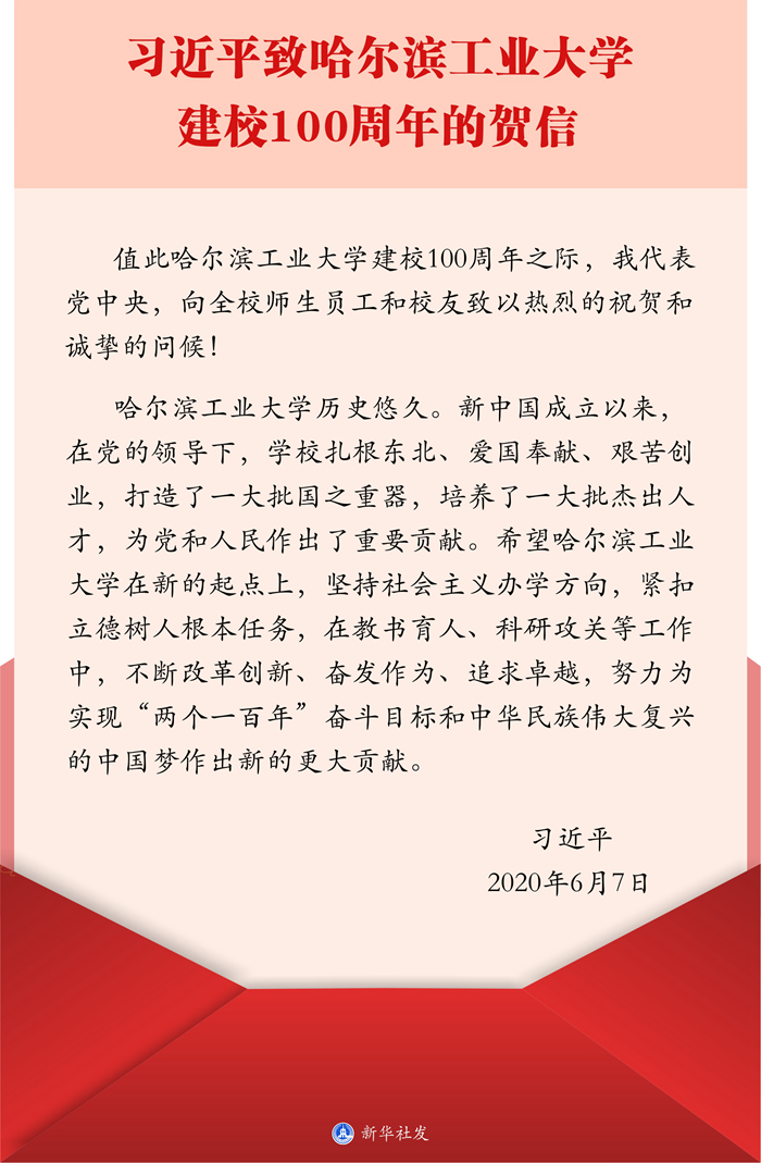 中共中央總書記、國家主席、中央軍委主席習(xí)近平7日致信祝賀哈爾濱工業(yè)大學(xué)建校100周年,向全校師生員工和校友致以熱烈的祝賀和誠摯的問候。