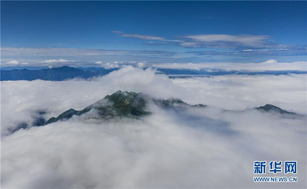 6月10日拍攝的漢中市南鄭區(qū)龍頭山主峰云海景觀(無人機(jī)照片)。雨后初霽,川陜交界的陜西省漢中市南鄭區(qū)龍頭山旅游景區(qū)云海涌動(dòng),風(fēng)光迷人。新華社記者陶明攝