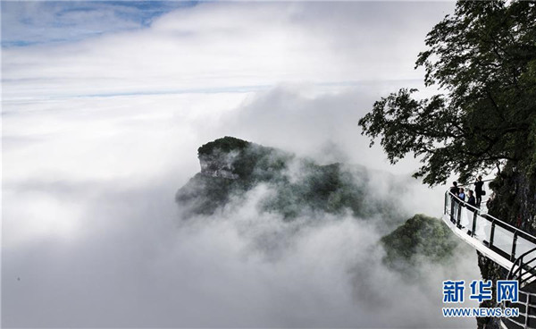 6月10日,游人在漢中市南鄭區(qū)龍頭山景區(qū)玻璃棧道上觀賞云海。雨后初霽,川陜交界的陜西省漢中市南鄭區(qū)龍頭山旅游景區(qū)云海涌動(dòng),風(fēng)光迷人。新華社記者陶明攝