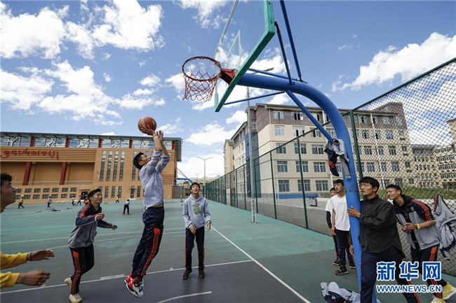 在四川省阿壩藏族羌族自治州阿壩縣藏文中學(xué)新的籃球場上,初中二年級男生在體育課上打籃球(6月14日攝),周圍則是新的教學(xué)樓和體育運動場館。新華社記者 沈伯韓 攝
