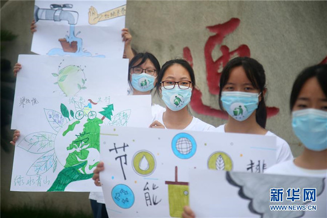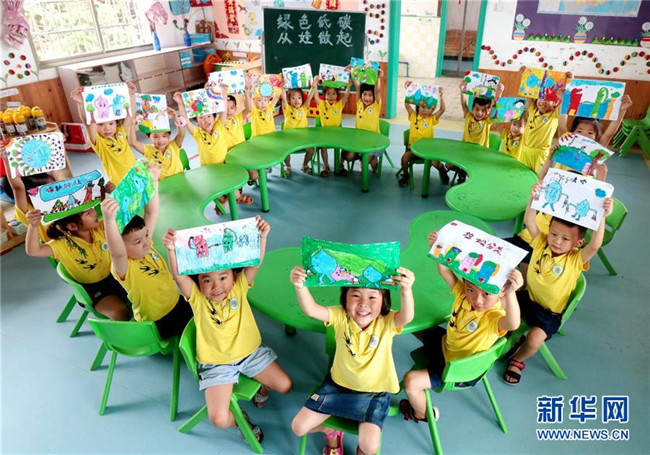 7月2日,湖南省漣源市橋頭河鎮(zhèn)新培童心幼兒園的小朋友展示手繪的低碳環(huán)保作品。新華社發(fā)(張揚(yáng)攝)
