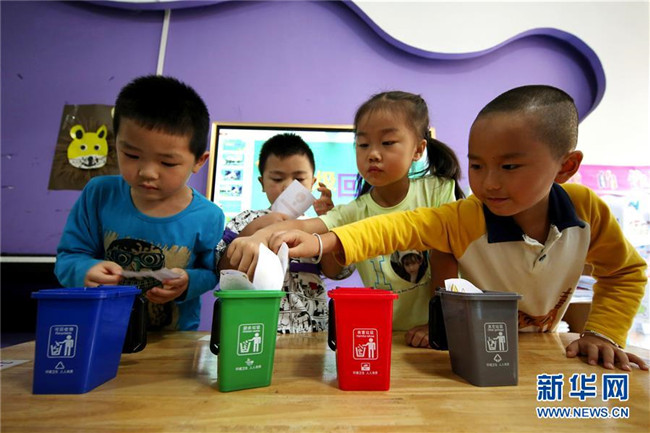7月2日,在貴州省丹寨縣第三幼兒園,小朋友學(xué)習(xí)垃圾分類投放。新華社發(fā)(黃曉海攝)