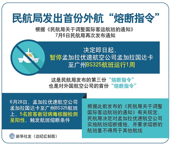 根據(jù)此前發(fā)布的《民航局關(guān)于調(diào)整國際客運航班的通知》有關(guān)規(guī)定,民航局決定對孟加拉優(yōu)速航空公司實施航班熔斷措施,并要求熔斷的航班量不得用于其他航線。(記者齊中熙)
