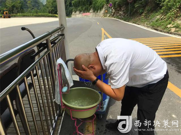 每來一輛車,聶鑫便急忙跑上去給剛剛停下的車轱轆下墊上防滑支架,柴小東則忙著給駕駛員舀水、遞風(fēng)油精,韓繼堂則上車檢查游客系安全帶的情況。駕駛員洗過臉后,他們將盆里用過的水迅速換上干凈的水,等待下一班駕駛員的到來。每天不厭其煩的重復(fù)著墊支架、舀水、換水、登車檢查的動(dòng)作,不會(huì)厭煩嗎?當(dāng)我看到他們臉上的微笑和滴落的汗珠時(shí),答案就不言而喻了,我試著問他們,現(xiàn)在最大的愿望是什么呢?我聽到的是一句最平凡而質(zhì)樸的回答,“最大的愿望是盼望能吹來一點(diǎn)涼風(fēng)。”