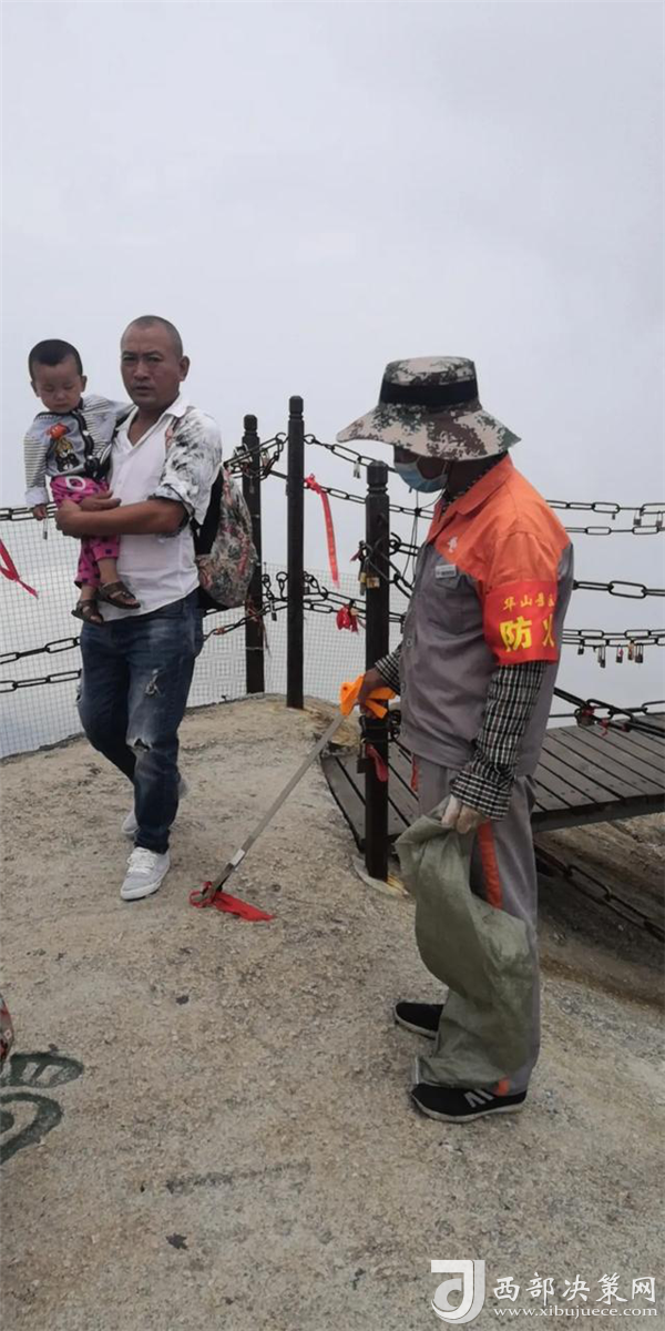 因?yàn)殚L時(shí)間彎腰撿拾垃圾,楊群社的脊背被太陽曬得火燒一樣疼,眼睛被光禿禿、白花花的華山花崗巖反射回來的太陽光刺得發(fā)澀暈眩。脊背燒得難忍時(shí),楊群社就找一個(gè)有風(fēng)的方向吹一吹;頭暈得厲害時(shí),楊群社用手揉一揉太陽穴、掐一掐鼻梁。
