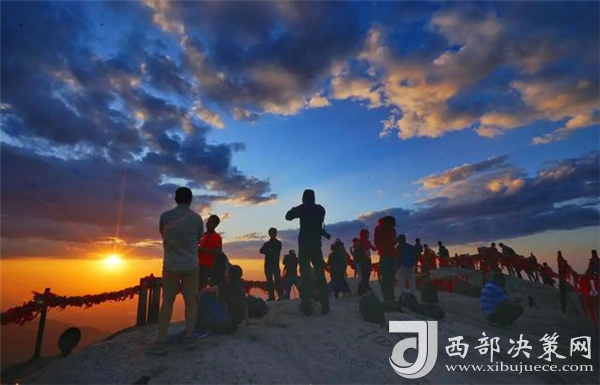由于華山最高海拔2154.9米,東峰朝陽臺又居高臨險,視野開闊,故為觀日出之最佳位置。旅游季節(jié),每日黎明時分,朝陽臺上,游人濟(jì)濟(jì),翹首以待這最輝煌、最壯觀的一刻。