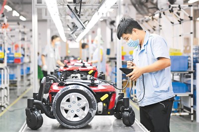 近來(lái),江西省豐城市外貿(mào)企業(yè)通過(guò)與電商平臺(tái)合作、云推介等方式促進(jìn)企業(yè)穩(wěn)產(chǎn)增效。圖為豐城市捷和電機(jī)(江西)有限公司員工在生產(chǎn)線上組裝電動(dòng)輪椅車(chē),準(zhǔn)備出口至歐洲、中東、非洲等地市場(chǎng)。周 亮攝(人民視覺(jué))