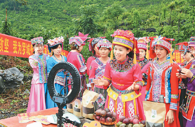 7月11日,廣西羅城仫佬族自治縣“仫佬十姐妹”直播團(tuán)隊(duì)在四把鎮(zhèn)集環(huán)村介紹當(dāng)?shù)剞r(nóng)特產(chǎn)品,通過(guò)電商直播“帶貨”,助力脫貧攻堅(jiān)。韋如代攝(人民視覺(jué))