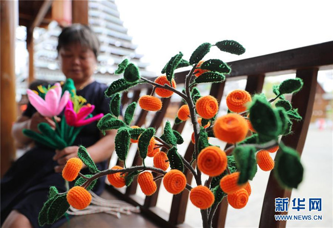 7月18日,在貴州省銅仁市玉屏侗族自治縣田坪鎮(zhèn)侗鄉(xiāng)風(fēng)情園內(nèi),易地扶貧搬遷群眾在加工手工藝品。新華社發(fā)(胡攀學(xué) 攝)