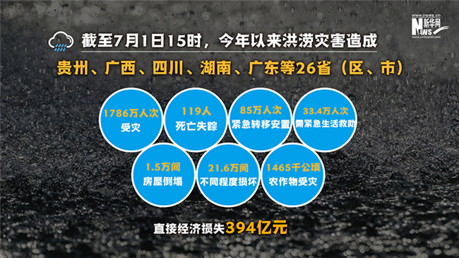 今年汛情帶來的破壞力有多強(qiáng)?張家團(tuán)告訴記者,截至7月1日15時,今年以來洪澇災(zāi)害造成貴州、廣西、四川、湖南、廣東等26?。▍^(qū)、市)1786萬人次受災(zāi),119人死亡失蹤,85萬人次緊急轉(zhuǎn)移安置,33.4萬人次需緊急生活救助;1.5萬間房屋倒塌,21.6萬間不同程度損壞;農(nóng)作物受災(zāi)面積1465千公頃,其中絕收150千公頃;直接經(jīng)濟(jì)損失394億元。