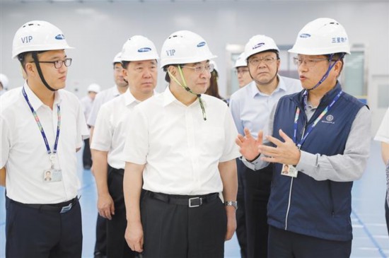 7月21日,省委書記胡和平到部分外資企業(yè)調(diào)研并召開座談會。圖為他在三星(中國)半導(dǎo)體公司閃存芯片二期項(xiàng)目現(xiàn)場聽取項(xiàng)目規(guī)劃介紹。 本報(bào)記者 張辰攝