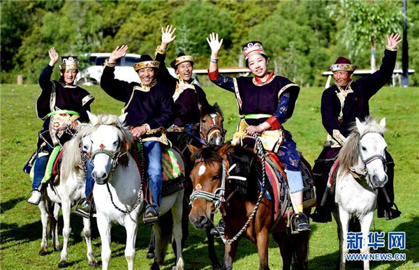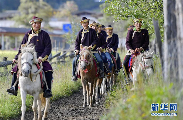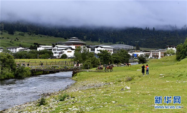 農(nóng)牧民在魯朗旅游小鎮(zhèn)騎行(7月26日攝)。新華社記者張汝鋒攝